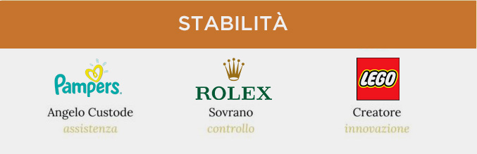- SOVRANO – ama avere il controllo e ambisce al potere e al successo. Il suo obiettivo è quello di creare un ambiente sicuro e prosperoso mettendo ordine nel caos. (Rolex, Microsoft)
